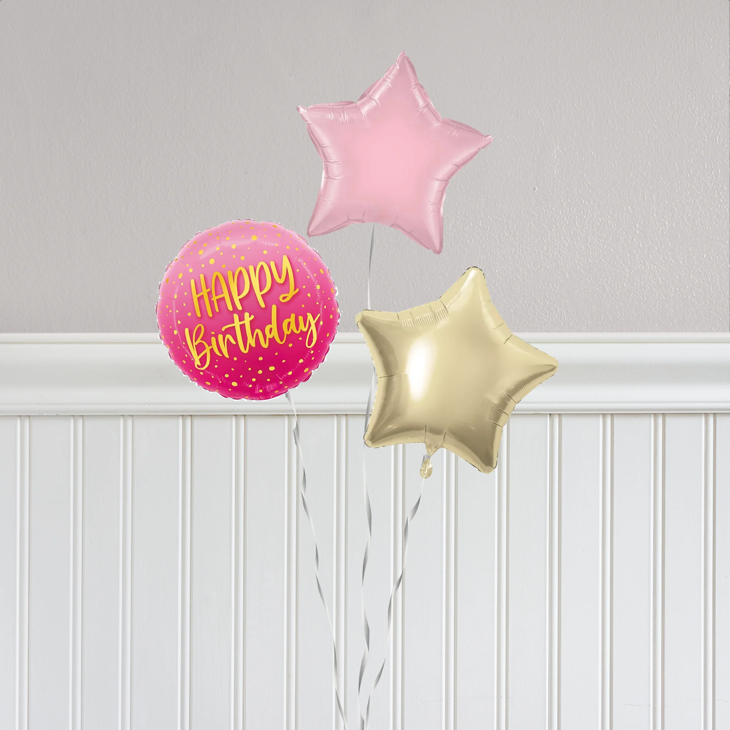 A helium pink confetti cake birthday bunch, the most perfect balloon gift bouquet for someone specials birthday. Included is 3 x standard 18 inch foil balloons. All balloons are attached to a matching colour ribbon and foil weight. To order your balloons, simply choose your nearest store below and when you would like to collect your balloons.