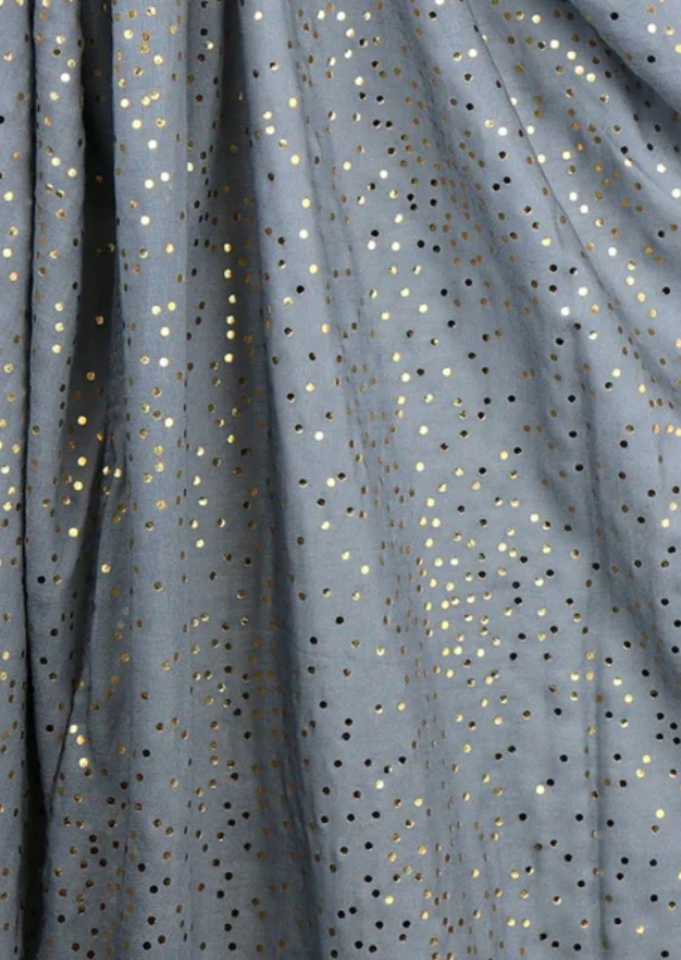 Grey viscose scarf with a metallic silver dot foil print.